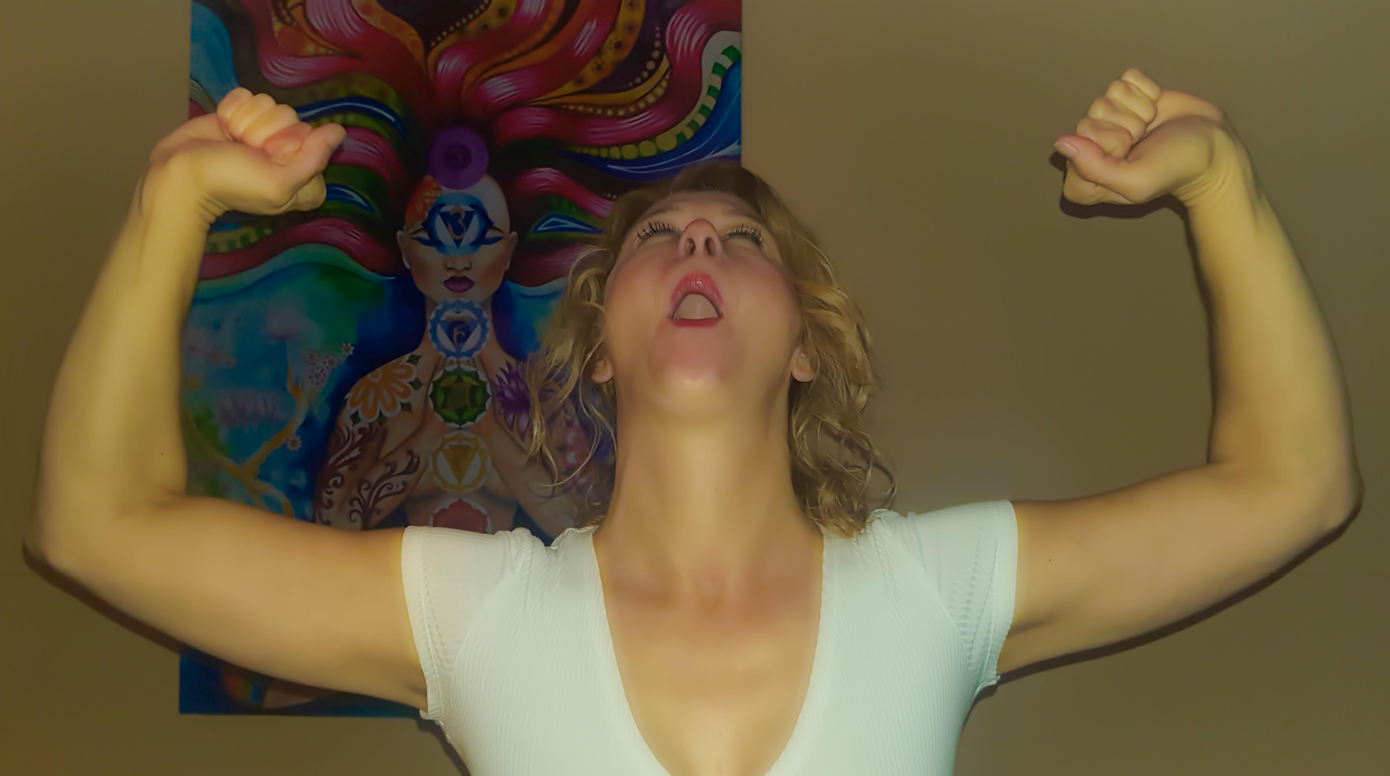 SLIKA 4: Višje, kot gredo roke, bolj napenjajte obraz. Ohranjajte dolgi »O«, povlek ustnic, nasmeh ličk, ter nagib glave. Ko z dvigovanjem rok dosežete najvišjo točko, se tam ustavite za 30 sekund.