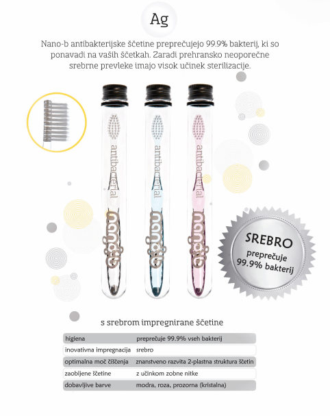 Svojo zobno ščetko menjajte na 3 – 4 mesece. Ščetine sčasoma postanejo obrabljene, njihova učinkovitost pa upada. Najboljši način za preprečevanje širjenja bakterij je, da redno menjujete ščetke, hkrati pa izbirate takšne, ki imajo celo antibakterijski učinek. Nano-b je stilsko oblikovana in kvalitetna zobna ščetka. Njena najpomembnejša lastnost pa je, da predstavlja steber vašega zdravja in samozavesti.