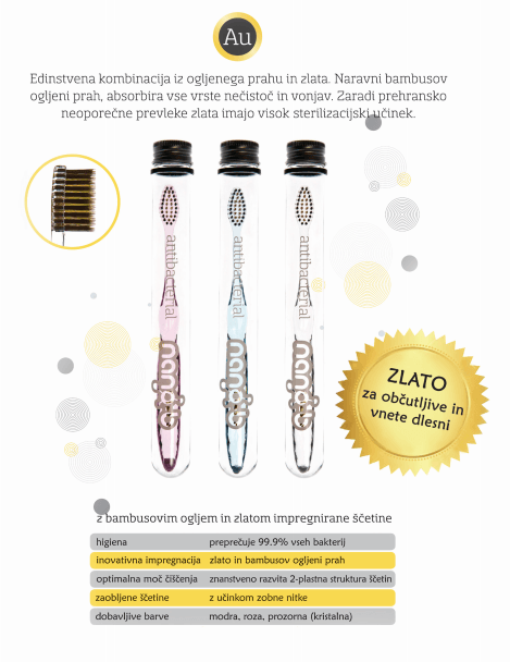 Vsaka Nano-b zobna ščetka ima na svojih ščetinah veliko število zlatih ali srebrnih nanodelcev, ki predstavljajo nespornega prvaka v uničevanju bakterij. Srebro in zlato neusmiljeno uničita do 99.99% vseh bakterij, ki se želijo približati zobni ščetki Nano-b. 1 Nano-b ščetka ima 1600 ščetin, prevlečenih z nanodelci zlata, srebra ali bambosovega oglja. Vsi skupaj imajo samo en cilj – uničiti vse bakterije in mikrobe! Bambusovo oglje v kombinaciji z naravno protibakterijsko zaščito zlatih nanodelcev zagotavlja prvovrstno oskrbo vaših ust. Najprej absorbira in odstrani vse nevarne spojine iz površin vaših zob: bakterije, obloge, mikrobe in strupe, s čimer zagotavlja popolno zaščito pred zobno gnilobo. Ravno zato so vaše dlesni in zobje zdravi.